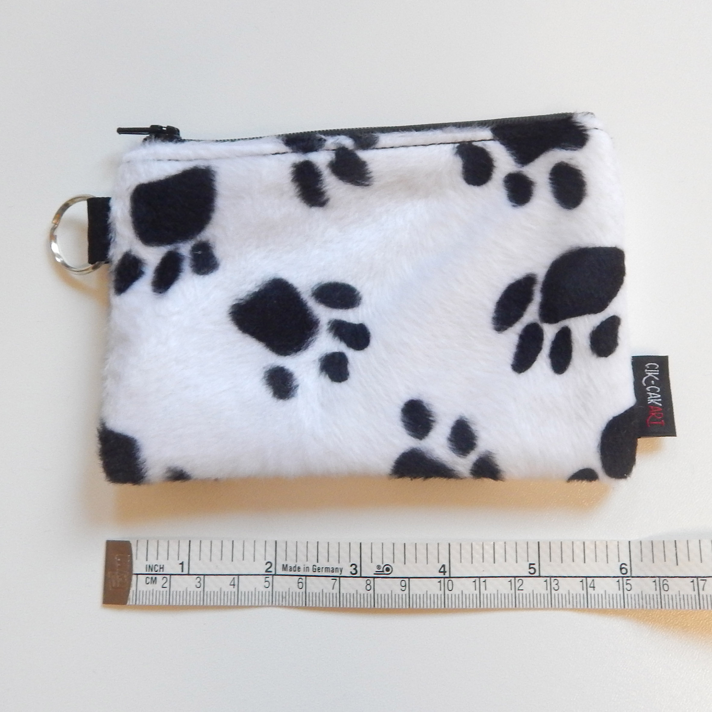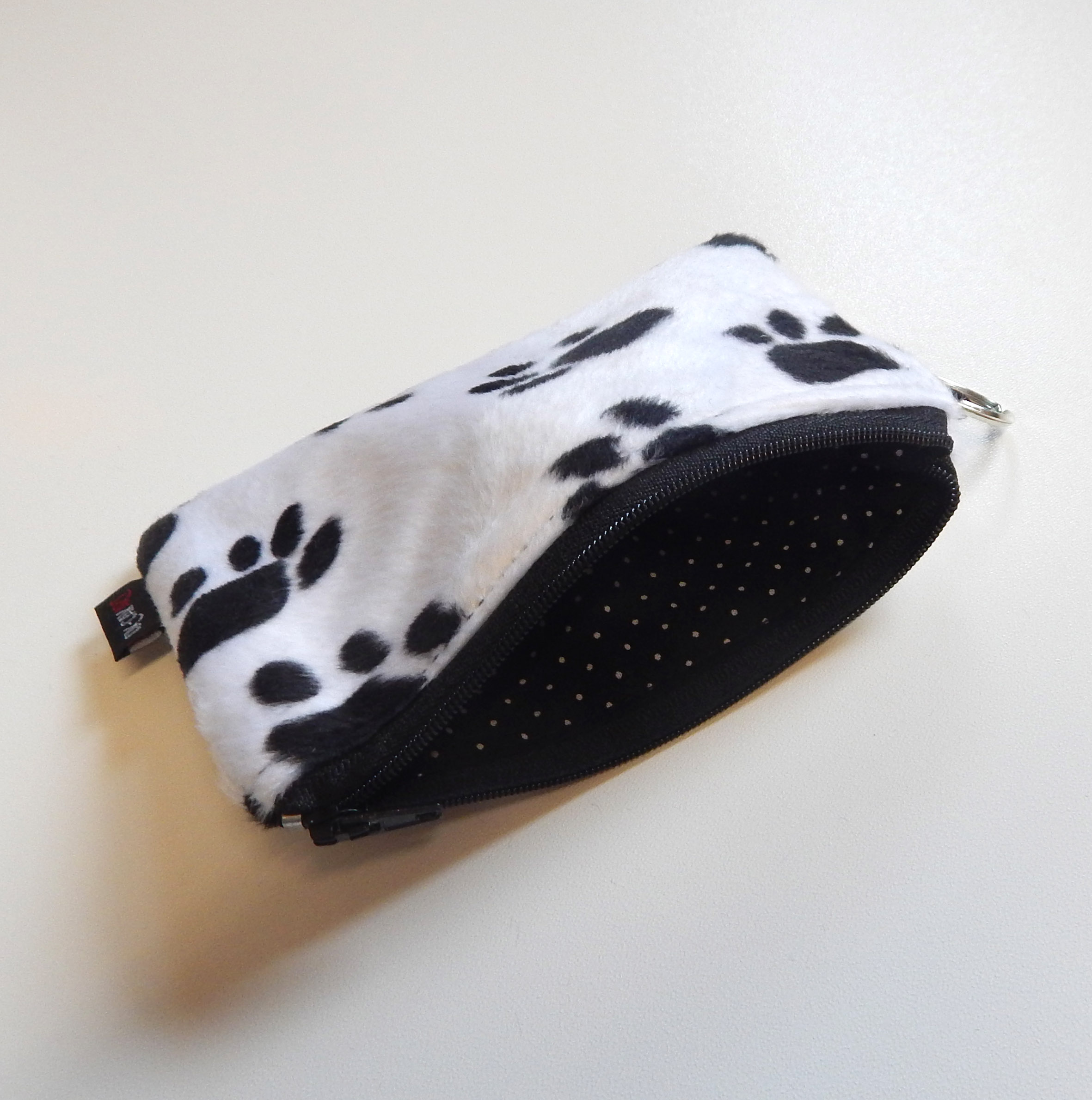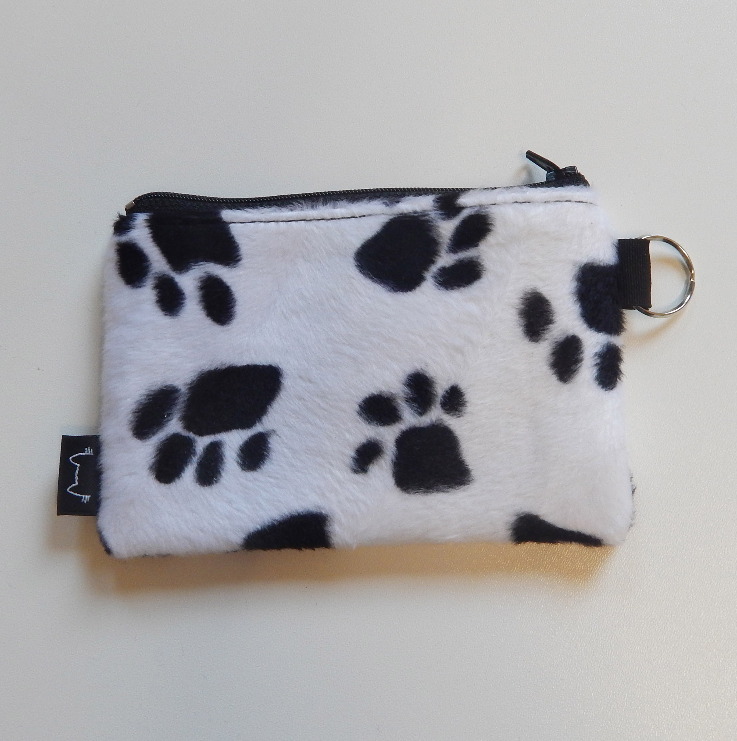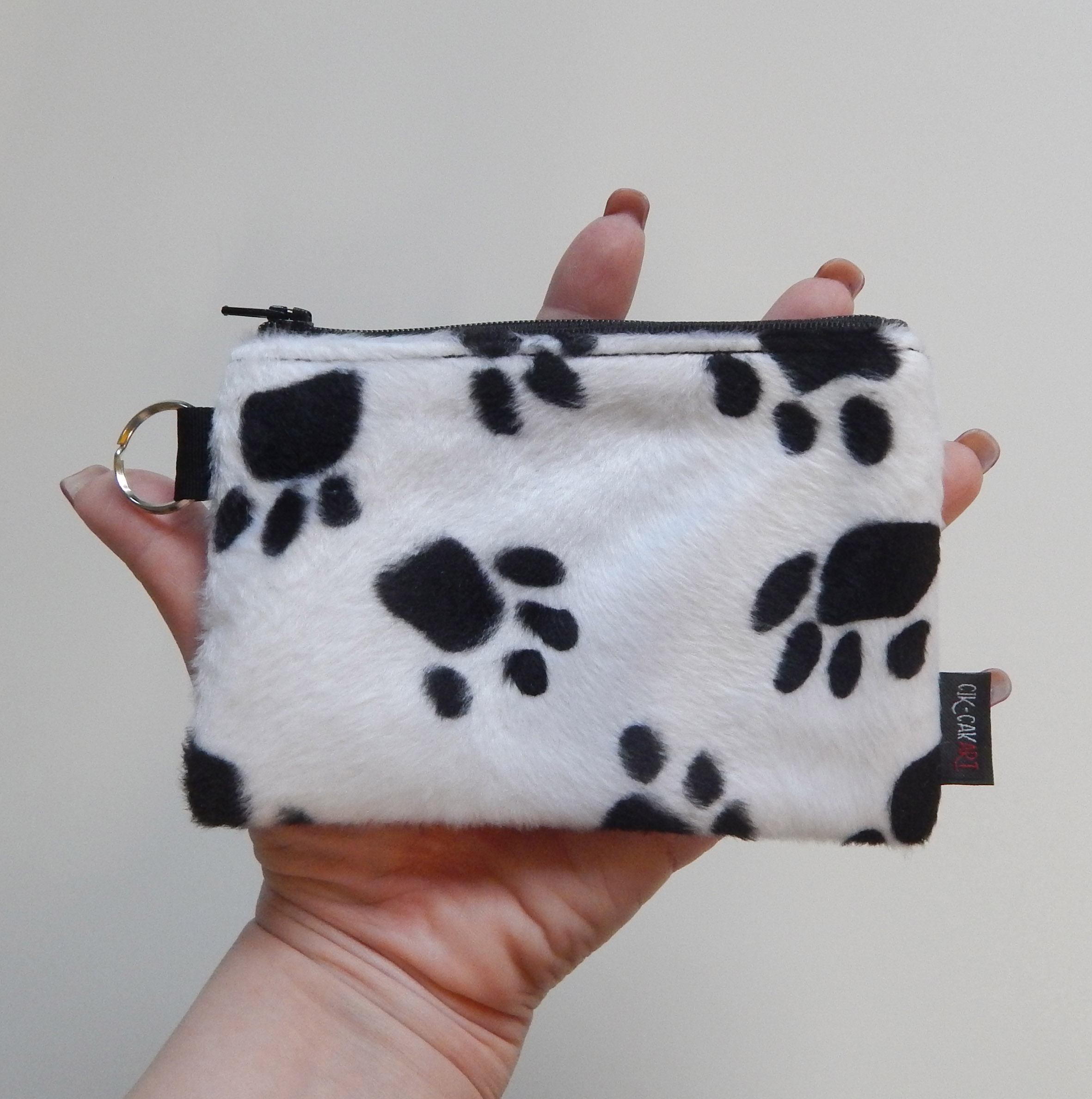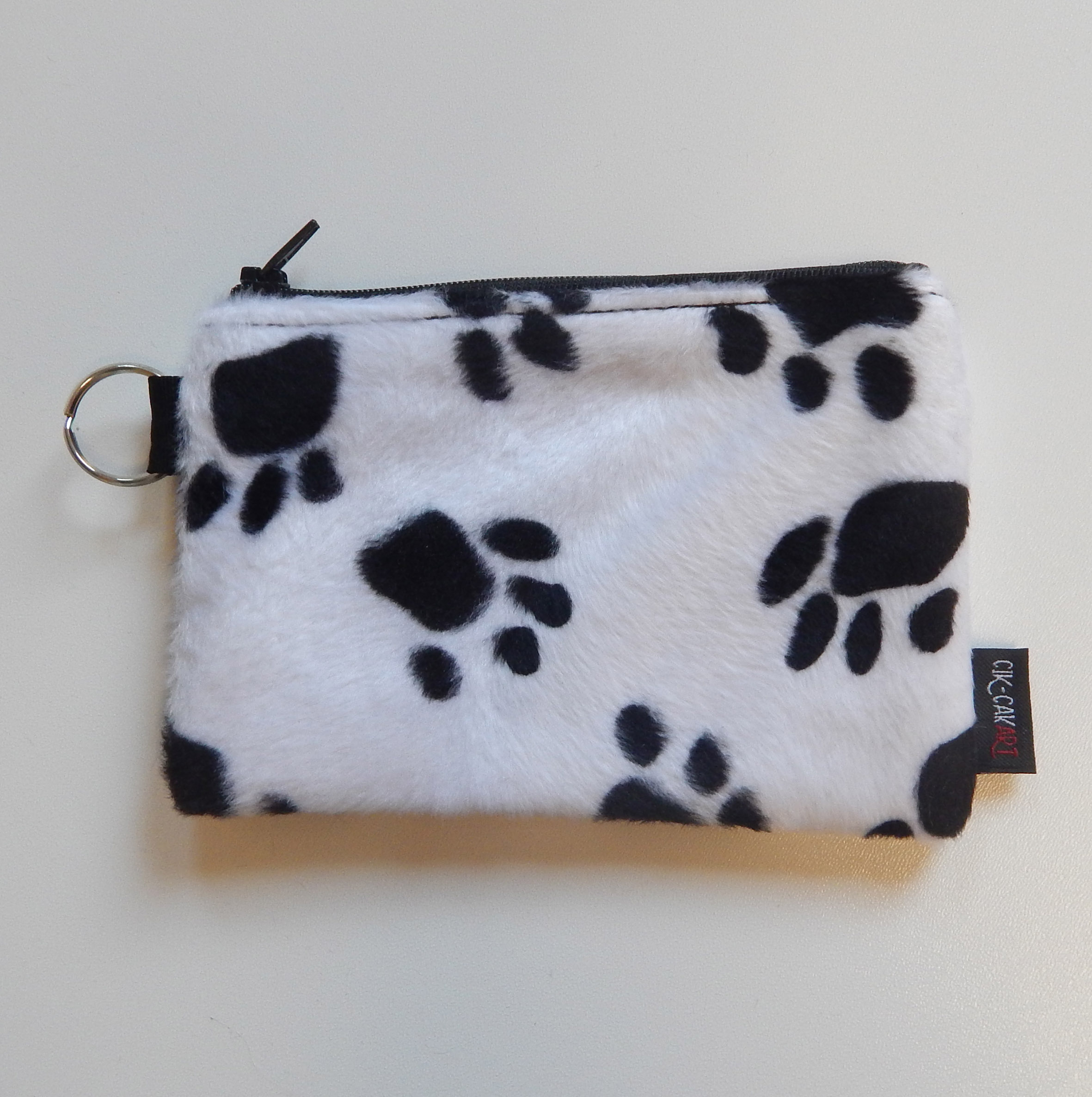 Simpatičan i zanimljiv novčanik od umjetnog krzna u uzorku crnih šapica na bijeloj podlozi.